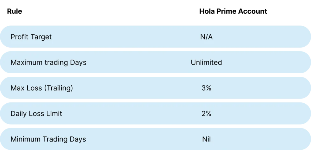 Direct Account is designed for seasoned traders looking to start an account, without any evaluation challenges, profit targets, or minimum trading days. This feature gives you immediate access to the Hola Prime Account, allowing you to start earning rewards right away.