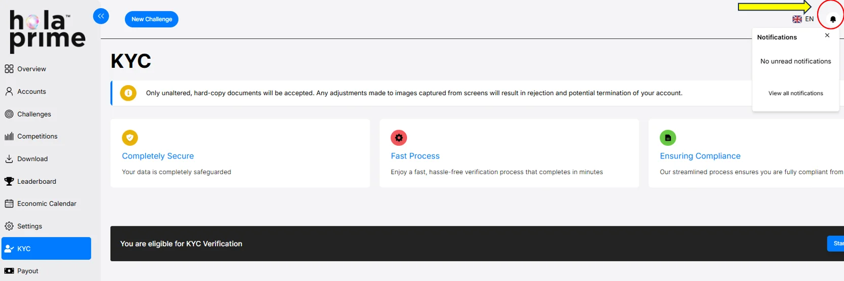 For buying a challenge, no documents are needed. However, to receive a Hola Prime Account, you’ll need to provide KYC documents and sign a contract that will be visible in your dashboard under the “Agreements” tab. Once your verification is successful & pay the on-time activation fee, we will send you the credentials of the Hola Prime Account.